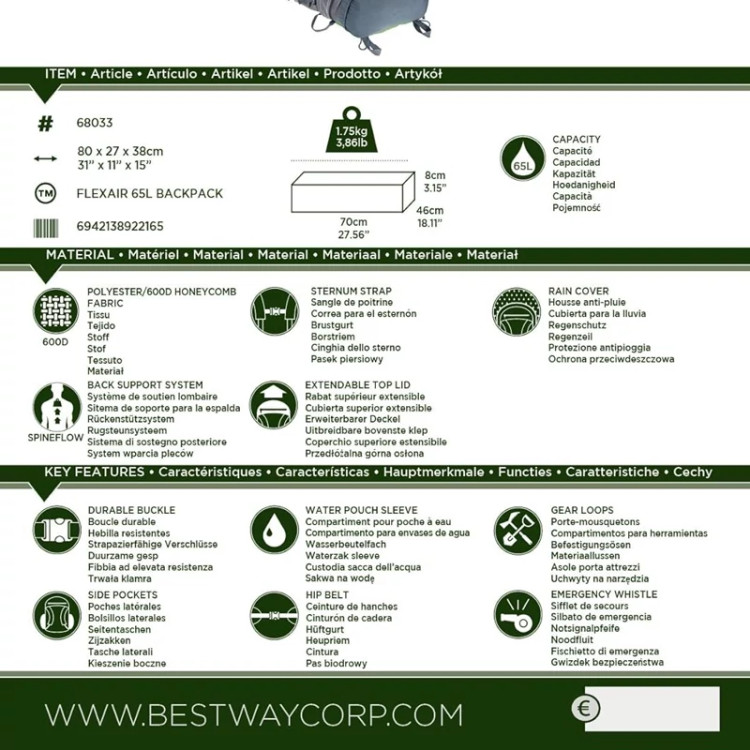 راحتی و قابلیت اطمینان ساخت کوله پشتی bestway با کمک یک قاب آلومینیومی قابل تنظیم ارائه می شود. یک کوله پشتی با ظرفیت حجم بالا و سیستم نوشیدنی امکان رفتن به تورهای طولانی را فراهم می کند. این تجهیزات را می توان به راحتی با کمک بند و طناب به کوله پشتی توریستی متصل کرد. بخش کیسه خواب; جیب های داخلی و جانبی راحت؛ محفظه سیستم نوشیدنی؛ پوشش باران؛ یک سوت آلارم