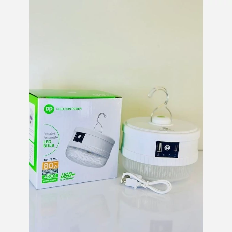 لامپ LED شارژی آویزدار دی پی ال ای دی مدل DP-7823B با توان خروجی 80 وات، محصولی کاربردی برای کمپینگ، طبیعتگردی و مسافرت است. پیش از استفاده، لازم است برچسب عایقی موجود روی باتری جدا شود تا اتصال برقرار گردد. این لامپ دارای کلید فیزیکی برای خاموش/روشن کردن و تغییر حالت نوردهی است و از طریق درگاه Type-C در مدت 5.5 ساعت قابل شارژ میباشد. تامین انرژی آن از طریق 3 عدد باتری AAA یا 2 عدد باتری 18650 با ظرفیت 4000 میلیآمپر و ولتاژ 3.7 ولت انجام میشود. مدت شارژدهی در حالت نوردهی ضعیف حدود 12 ساعت، متوسط 4.5 ساعت و قوی حدود 3.5 ساعت است